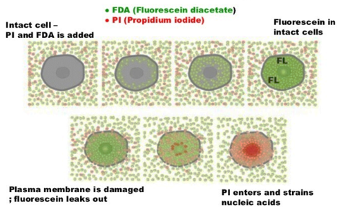 In Vitro Fluorescein Diacetate/Propidium Iodide (FDA/PI) Staining Assay using fluorescence microscope.